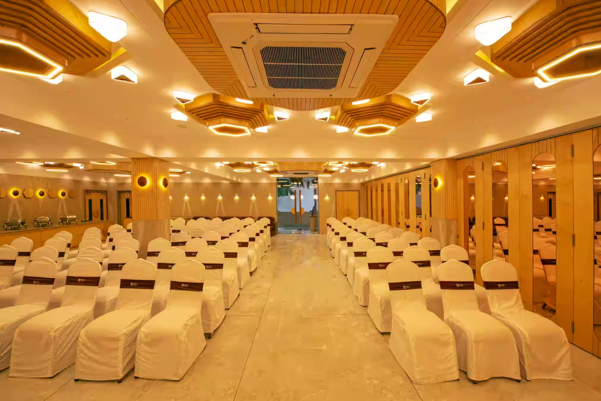 Golden Banquet at Rudra Shelter Business Hotel, Vasai East offers a 10,000 SQFT pillar-less air-conditioned hall with flexible theater, round table, and classroom-style seating.